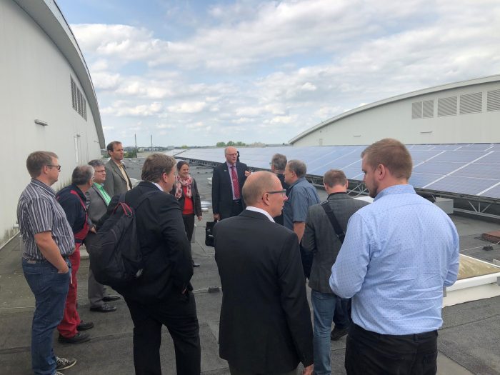 Besucht wurde das Wohnquartier „Neue Ufer“ am Phoenixsee Dortmund. Hierbei haben die Kraftwirte der Stadtwerke Lemgo GmbH als Contractor eine 2 x 135 kW Holzpellet-Anlage inkl. 3 x 1.500 Liter Pufferspeicher zur Wärmeversorgung für rund 44 moderne Wohnungen errichtet und zudem noch die Planung, Finanzierung und den Betrieb übernommen. Dann ging es weiter in die Westfalenhallen Dortmund. Diese werden seit über 30 Jahren durch die Dortmunder Energie- und Wasserversorgung GmbH (DEW21) als Contractor betreut. Dabei werden diverse Hallen, ein Eissportzentrum, ein Leichtathletikzentrum, ein Hotel sowie ein Verwaltungsgebäude mit einer Gesamtleistung von etwa 15 MW mit Wärme versorgt. Zudem errichtete die DEW21 auf den Westfalenhallen als Contractor die damals größte dachgestützte PV-Anlage nördlich der Mainlinie mit einer Gesamtkapazität von 1,68 MWp.