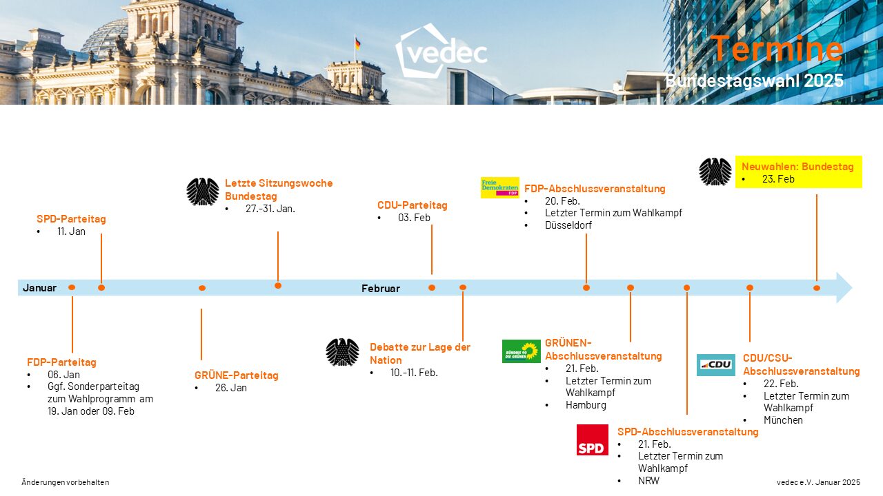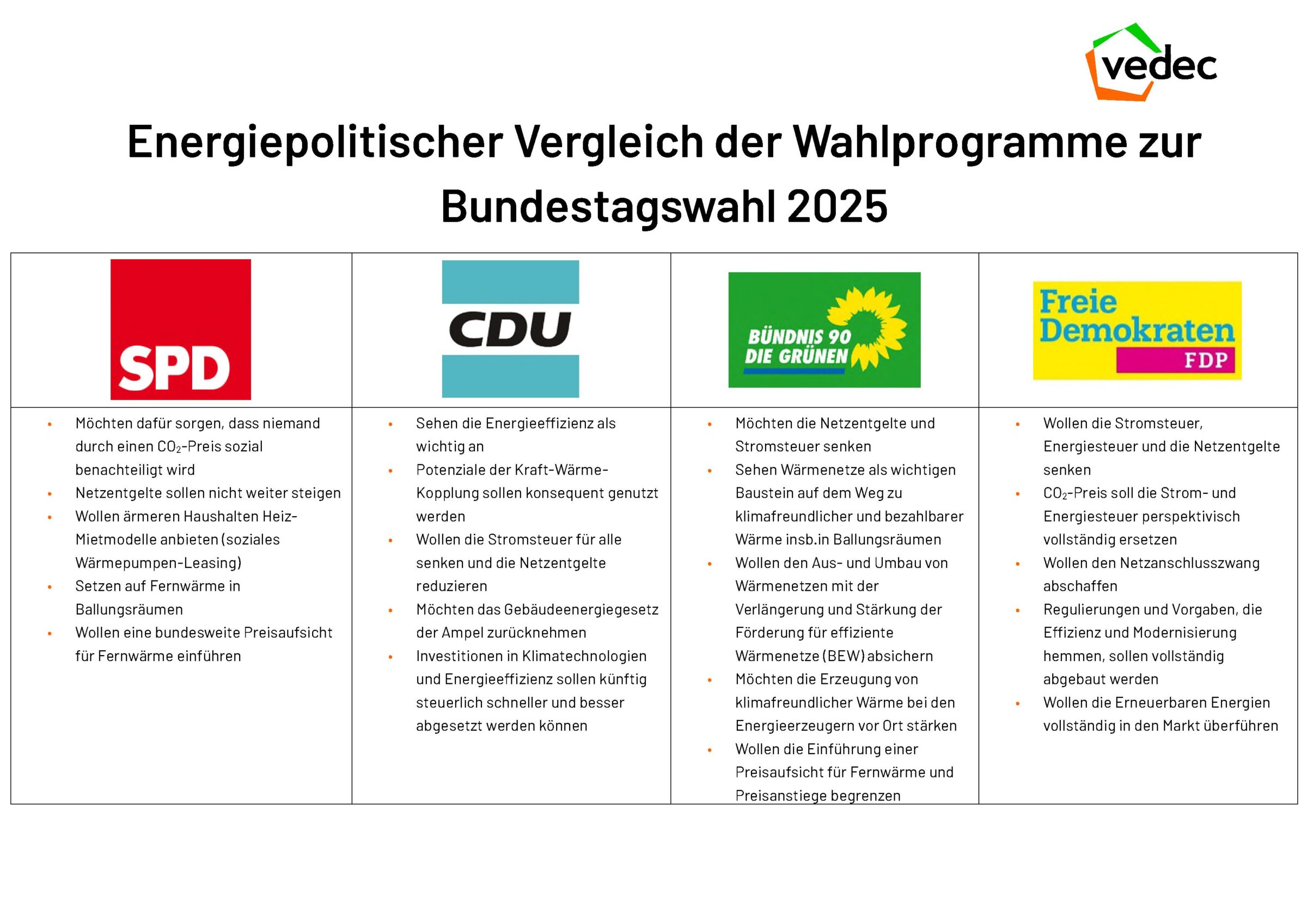 Am 23.02.2025 wählte Deutschland einen neuen Bundestag. Wir beobachten genau, welche Rolle dezentrale Contracting-Lösungen in der Zukunft einnehmen sollen und wie die etablierten Parteien Erneuerbare Energien verstärkt in die Wärmeversorgung integrieren möchten. Mit energiepolitisch engagierten Bundestagsabgeordneten haben wir Kurzinterviews geführt, die Sie hier abrufen können. Zusätzlich vergleichen wir für Sie die Wahlprogramme der Parteien. Nachfolgend finden Sie eine Auswahl der TOP 5 der energiepolitischen Forderungen der Parteien.