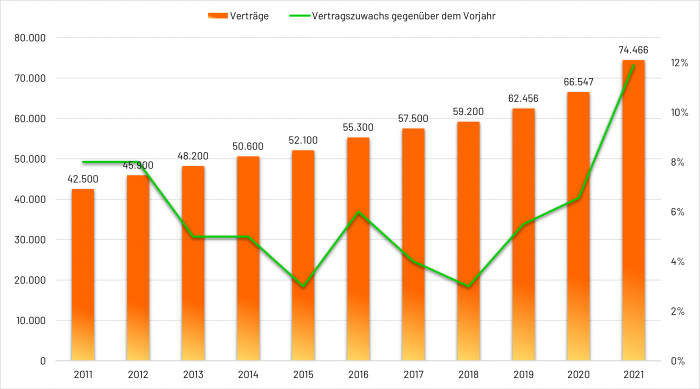 Der Vertragszuwachs verhält sich im Jahr 2023 weiterhin stabil. Mit 5,1 % Zuwachs sinkt er im Vergleich zum letzten Jahr lediglich leicht. Der geringere Zuwachs ist auf die unsichere politische Lage zurückzuführen. Insbesondere wechselnde Rahmenbedingungen beim Gebäudeenergiegesetz (GEG) wirken sich negativ auf die Contracting-Branche aus.